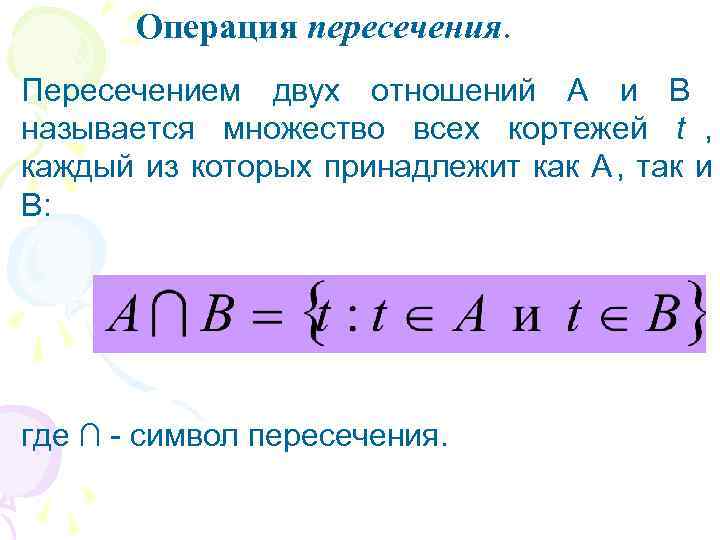 Операция пересечения. Пересечением двух отношений A и B называется множество всех кортежей t , каждый из которых принадлежит как A, так и B: где ∩ - символ пересечения.