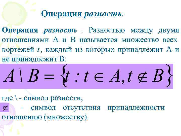 Операция разность. Разностью между двумя отношениями A и B называется множество всех кортежей t , каждый из которых принадлежит A и не принадлежит B: где - символ разности, - символ отсутствия принадлежности отношению (множеству).