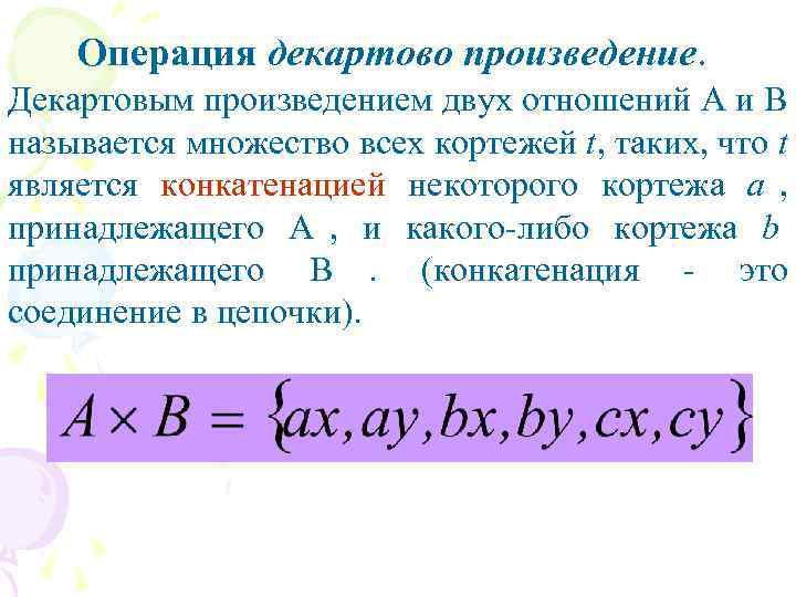 Операция декартово произведение. Декартовым произведением двух отношений A и B называется множество всех кортежей t, таких, что t является конкатенацией некоторого кортежа а , принадлежащего A , и какого-либо кортежа b , принадлежащего B. (конкатенация - это соединение в цепочки).
