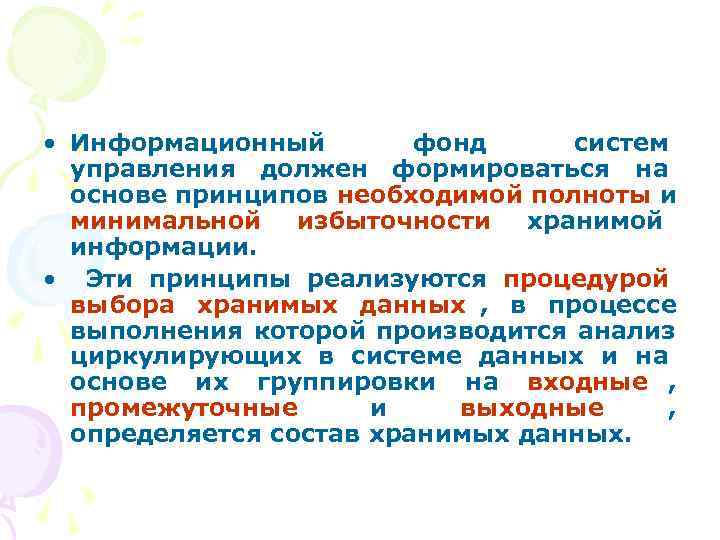 • Информационный фонд систем управления должен формироваться на основе принципов необходимой полноты и минимальной избыточности хранимой информации. • Эти принципы реализуются процедурой выбора хранимых данных , в процессе выполнения которой производится анализ циркулирующих в системе данных и на основе их группировки на входные , промежуточные и выходные , определяется состав хранимых данных.