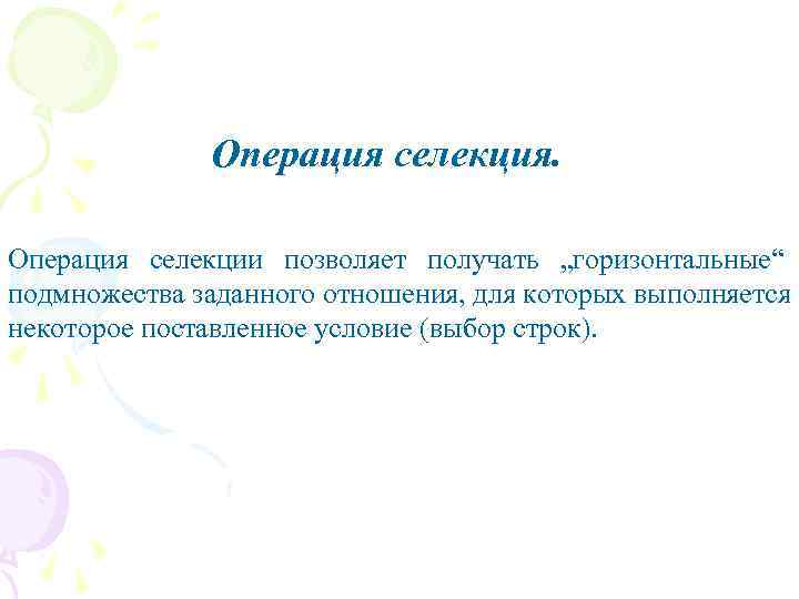Операция селекция. Операция селекции позволяет получать „горизонтальные“ подмножества заданного отношения, для которых выполняется некоторое поставленное условие (выбор строк).