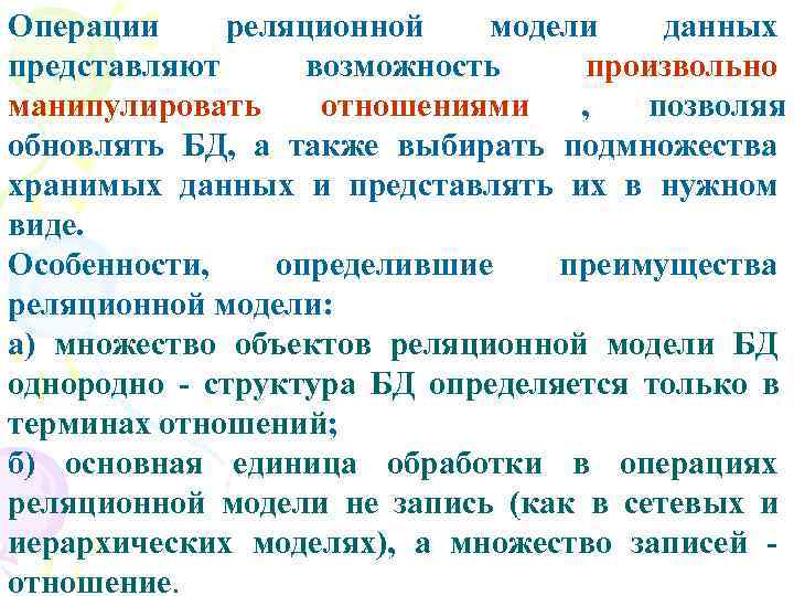 Операции реляционной модели данных представляют возможность произвольно манипулировать отношениями , позволяя обновлять БД, а также выбирать подмножества хранимых данных и представлять их в нужном виде. Особенности, определившие преимущества реляционной модели: а) множество объектов реляционной модели БД однородно - структура БД определяется только в терминах отношений; б) основная единица обработки в операциях реляционной модели не запись (как в сетевых и иерархических моделях), а множество записей - отношение.