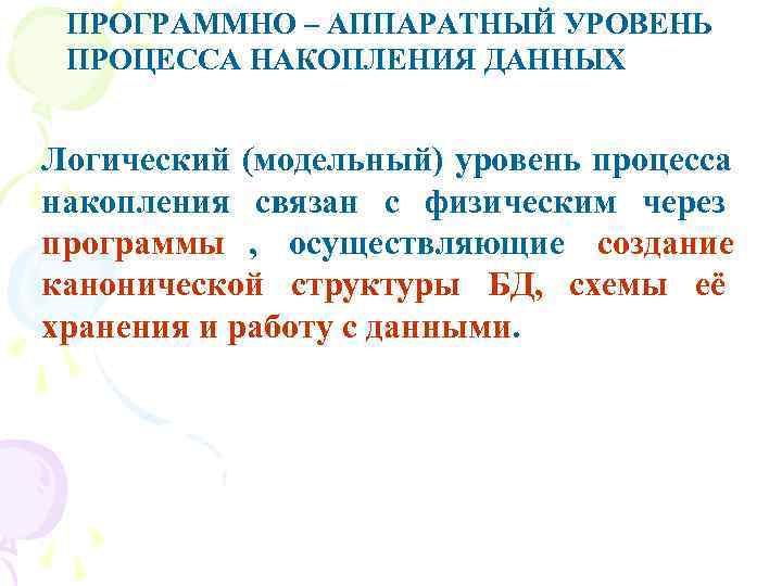 ПРОГРАММНО – АППАРАТНЫЙ УРОВЕНЬ ПРОЦЕССА НАКОПЛЕНИЯ ДАННЫХ Логический (модельный) уровень процесса накопления связан с физическим через программы , осуществляющие создание канонической структуры БД, схемы её хранения и работу с данными.