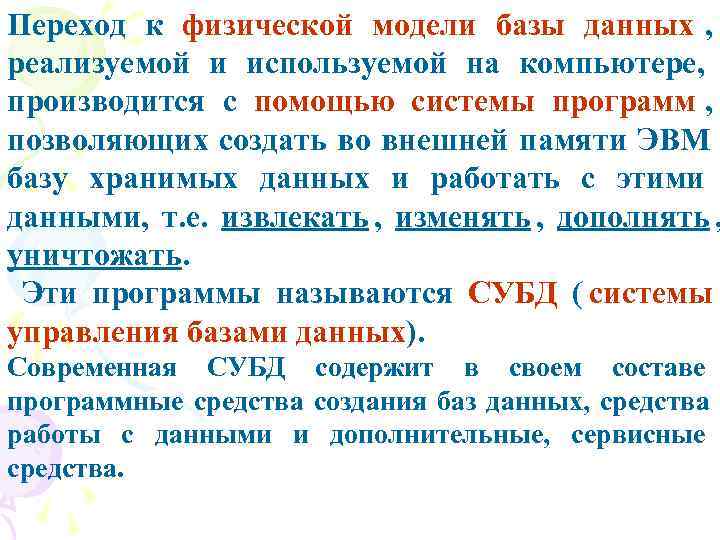 Переход к физической модели базы данных , реализуемой и используемой на компьютере, производится с помощью системы программ , позволяющих создать во внешней памяти ЭВМ базу хранимых данных и работать с этими данными, т. е. извлекать , изменять , дополнять , уничтожать. Эти программы называются СУБД ( системы управления базами данных). Современная СУБД содержит в своем составе программные средства создания баз данных, средства работы с данными и дополнительные, сервисные средства.