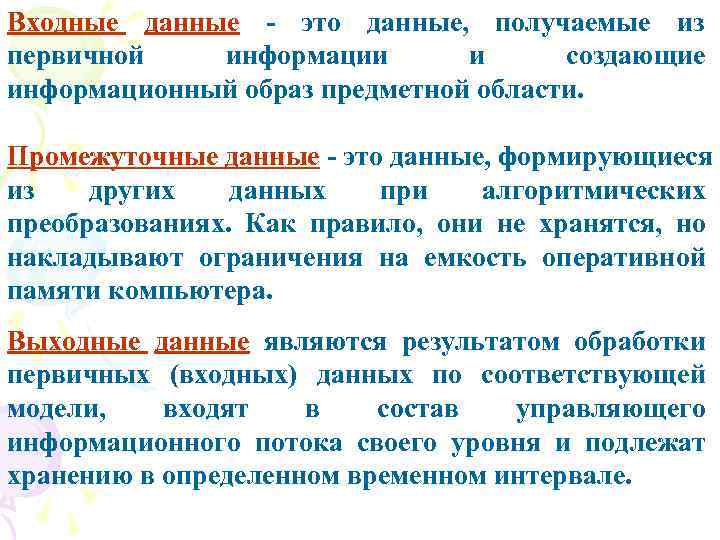 Входные данные - это данные, получаемые из первичной информации и создающие информационный образ предметной области. Промежуточные данные - это данные, формирующиеся из других данных при алгоритмических преобразованиях. Как правило, они не хранятся, но накладывают ограничения на емкость оперативной памяти компьютера. Выходные данные являются результатом обработки первичных (входных) данных по соответствующей модели, входят в состав управляющего информационного потока своего уровня и подлежат хранению в определенном временном интервале.