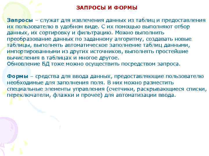 ЗАПРОСЫ И ФОРМЫ Запросы – служат для извлечения данных из таблиц и предоставления их пользователю в удобном виде. С их помощью выполняют отбор данных, их сортировку и фильтрацию. Можно выполнить преобразование данных по заданному алгоритму, создавать новые таблицы, выполнять автоматическое заполнение таблиц данными, импортированными из других источников, выполнять простейшие вычисления в таблицах и многое другое. Обновление БД тоже можно осуществить посредством запроса. Формы – средства для ввода данных, предоставляющие пользователю необходимые для заполнения поля. В них можно разместить специальные элементы управления (счетчики, раскрывающиеся списки, переключатели, флажки и прочее) для автоматизации ввода.