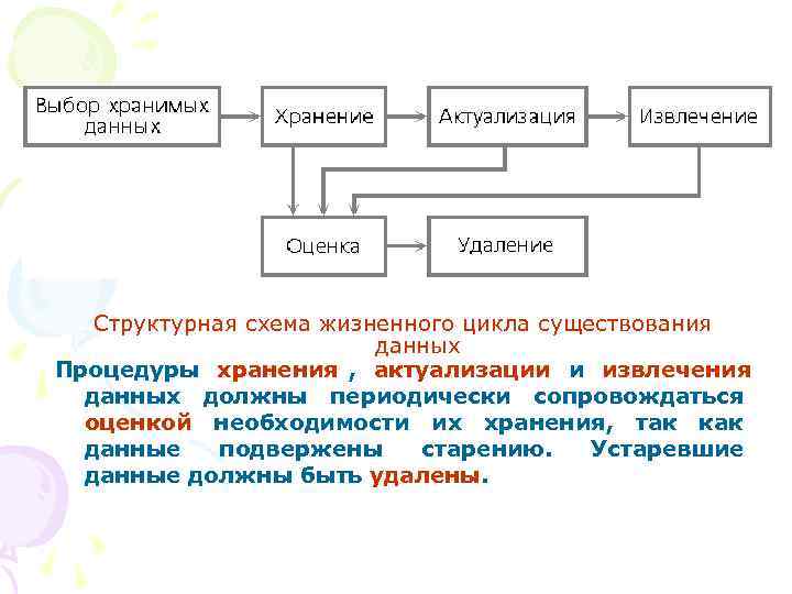 Структурная схема жизненного цикла существования данных Процедуры хранения , актуализации и извлечения данных должны периодически сопровождаться оценкой необходимости их хранения, так как данные подвержены старению. Устаревшие данные должны быть удалены.