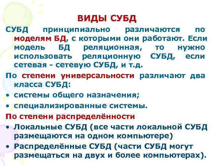 ВИДЫ СУБД принципиально различаются по моделям БД, с которыми они работают. Если модель БД реляционная, то нужно использовать реляционную СУБД, если сетевая - сетевую СУБД, и т. д. По степени универсальности различают два класса СУБД: • системы общего назначения; • специализированные системы. По степени распределённости • Локальные СУБД (все части локальной СУБД размещаются на одном компьютере) • Распределённые СУБД (части СУБД могут размещаться на двух и более компьютерах).