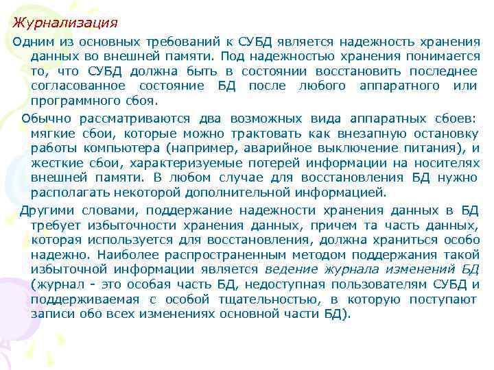 Журнализация Одним из основных требований к СУБД является надежность хранения данных во внешней памяти. Под надежностью хранения понимается то, что СУБД должна быть в состоянии восстановить последнее согласованное состояние БД после любого аппаратного или программного сбоя. Обычно рассматриваются два возможных вида аппаратных сбоев: мягкие сбои, которые можно трактовать как внезапную остановку работы компьютера (например, аварийное выключение питания), и жесткие сбои, характеризуемые потерей информации на носителях внешней памяти. В любом случае для восстановления БД нужно располагать некоторой дополнительной информацией. Другими словами, поддержание надежности хранения данных в БД требует избыточности хранения данных, причем та часть данных, которая используется для восстановления, должна храниться особо надежно. Наиболее распространенным методом поддержания такой избыточной информации является ведение журнала изменений БД (журнал - это особая часть БД, недоступная пользователям СУБД и поддерживаемая с особой тщательностью, в которую поступают записи обо всех изменениях основной части БД).