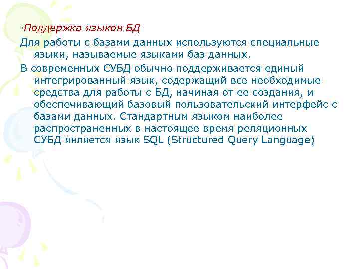 ·Поддержка языков БД Для работы с базами данных используются специальные языки, называемые языками баз данных. В современных СУБД обычно поддерживается единый интегрированный язык, содержащий все необходимые средства для работы с БД, начиная от ее создания, и обеспечивающий базовый пользовательский интерфейс с базами данных. Стандартным языком наиболее распространенных в настоящее время реляционных СУБД является язык SQL (Structured Query Language)