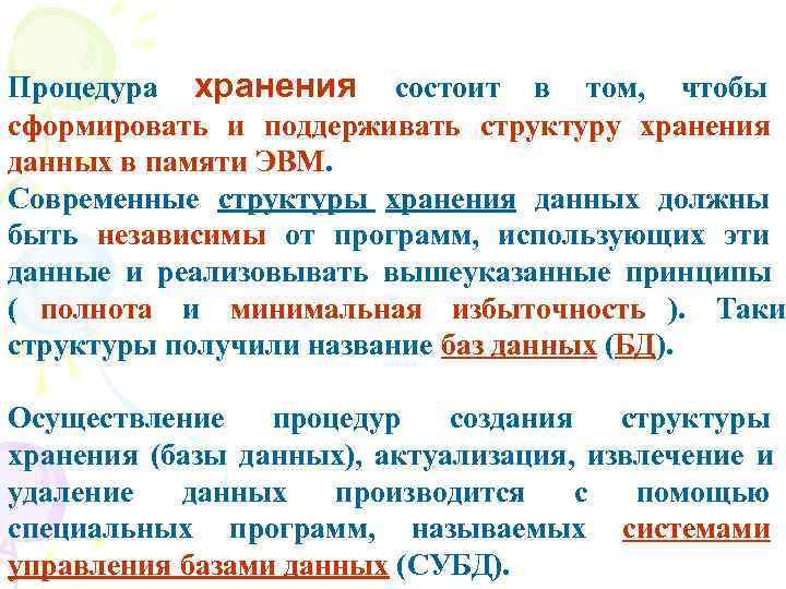 Процедура хранения состоит в том, чтобы сформировать и поддерживать структуру хранения данных в памяти ЭВМ. Современные структуры хранения данных должны быть независимы от программ, использующих эти данные и реализовывать вышеуказанные принципы ( полнота и минимальная избыточность ). Таки структуры получили название баз данных (БД). Осуществление процедур создания структуры хранения (базы данных), актуализация, извлечение и удаление данных производится с помощью специальных программ, называемых системами управления базами данных (СУБД).
