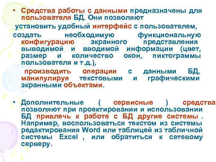 • Средства работы с данными предназначены для пользователя БД. Они позволяют установить удобный интерфейс с пользователем, создать необходимую функциональную конфигурацию экранного представления выводимой и вводимой информации (цвет, размер и количество окон, пиктограммы пользователя и т. д. ), производить операции с данными БД, манипулируя текстовыми и графическими экранными объектами. • Дополнительные ( сервисные ) средства позволяют при проектировании и использовании БД привлечь к работе с БД другие системы. Например, воспользоваться текстом из системы редактирования Word или таблицей из табличной системы Excel , или обратиться к сетевому серверу.