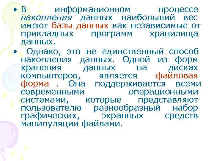 • В информационном процессе накопления данных наибольший вес имеют базы данных как независимые от прикладных программ хранилища данных. • Однако, это не единственный способ накопления данных. Одной из форм хранения данных на дисках компьютеров, является файловая форма. Она поддерживается всеми современными операционными системами, которые представляют пользователю разнообразный набор графических, экранных средств манипуляции файлами.