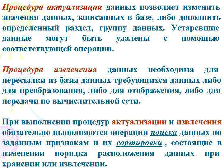 Процедура актуализации данных позволяет изменить значения данных, записанных в базе, либо дополнить определенный раздел, группу данных. Устаревшие данные могут быть удалены с помощью соответствующей операции. Процедура извлечения данных необходима для пересылки из базы данных требующихся данных либо для преобразования, либо для отображения, либо для передачи по вычислительной сети. При выполнении процедур актуализации и извлечения обязательно выполняются операции поиска данных по заданным признакам и их сортировки , состоящие в изменении порядка расположения данных при хранении или извлечении.
