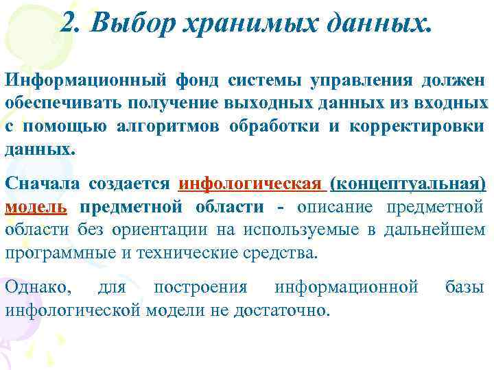 2. Выбор хранимых данных. Информационный фонд системы управления должен обеспечивать получение выходных данных из входных с помощью алгоритмов обработки и корректировки данных. Сначала создается инфологическая (концептуальная) модель предметной области - описание предметной области без ориентации на используемые в дальнейшем программные и технические средства. Однако, для построения информационной базы инфологической модели не достаточно.
