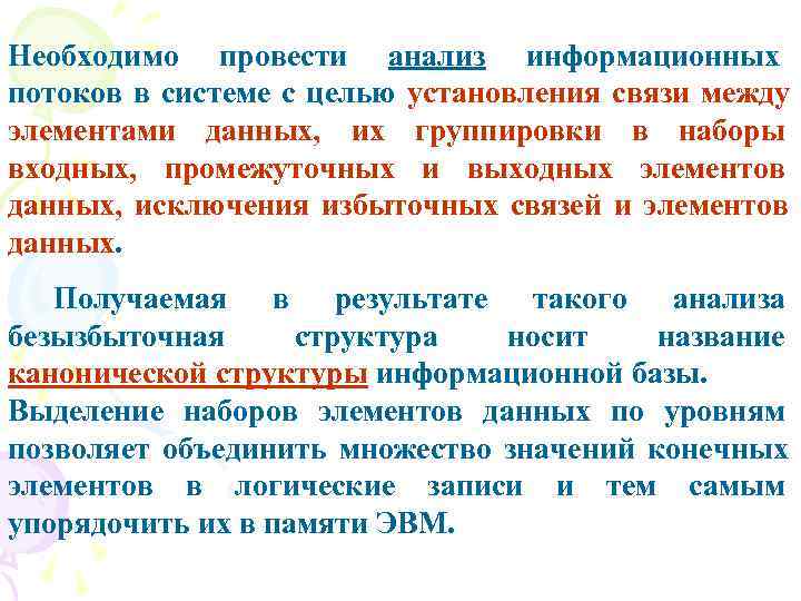 Необходимо провести анализ информационных потоков в системе с целью установления связи между элементами данных, их группировки в наборы входных, промежуточных и выходных элементов данных, исключения избыточных связей и элементов данных. Получаемая в результате такого анализа безызбыточная структура носит название канонической структуры информационной базы. Выделение наборов элементов данных по уровням позволяет объединить множество значений конечных элементов в логические записи и тем самым упорядочить их в памяти ЭВМ.