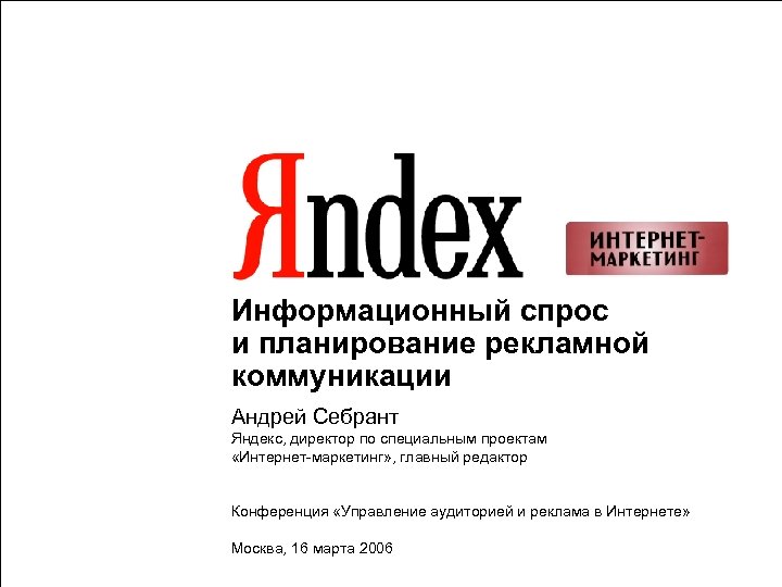 Информационный спрос и планирование рекламной коммуникации Андрей Себрант Яндекс, директор по специальным проектам «Интернет-маркетинг» , главный редактор Конференция «Управление аудиторией и реклама в Интернете» Москва, 16 марта 2006