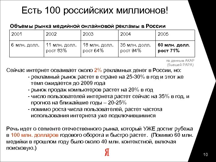 Есть 100 российских миллионов! Объемы рынка медийной онлайновой рекламы в России 2001 2002 2003 2004 2005 6 млн. долл. 11 млн. долл. рост 83% 18 млн. долл. рост 64% 35 млн. долл. рост 94% 60 млн. долл. рост 71% по данным АКАР (бывшей РАРА) Сейчас интернет осваивает около 2% рекламных денег в России, но: - рекламный рынок растет в стране на 25 -30% в год и этот же темп ожидается до 2009 года - рынок продаж компьютеров растет на 20% в год - число пользователей интернета растет сейчас на 35% в год, и прогноз на ближайшие годы – 20 -25% - помимо роста числа пользователей, растет частота использования интернета уже подключившимися Речь идет о сегменте отечественного рынка, который УЖЕ достиг рубежа в 100 млн. долларов годового оборота и быстро растет. (Помимо 60 млн. медийки в прошлом году было около 40 млн. контекстной, включая поисковую. ) 10