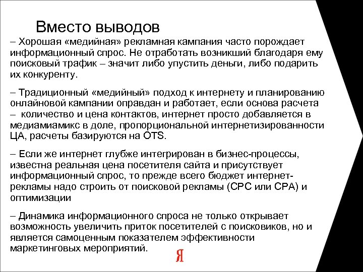 Вместо выводов – Хорошая «медийная» рекламная кампания часто порождает информационный спрос. Не отработать возникший благодаря ему поисковый трафик – значит либо упустить деньги, либо подарить их конкуренту. – Традиционный «медийный» подход к интернету и планированию онлайновой кампании оправдан и работает, если основа расчета – количество и цена контактов, интернет просто добавляется в медиамиамикс в доле, пропорциональной интернетизированности ЦА, расчеты базируются на OTS. – Если же интернет глубже интегрирован в бизнес-процессы, известна реальная цена посетителя сайта и присутствует информационный спрос, то прежде всего бюджет интернетрекламы надо строить от поисковой рекламы (CPC или CPA) и оптимизации – Динамика информационного спроса не только открывает возможность увеличить приток посетителей с поисковиков, но и является самоценным показателем эффективности маркетинговых мероприятий.