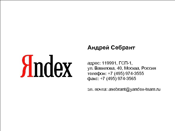 Андрей Себрант адрес: 119991, ГСП-1, ул. Вавилова, 40, Москва, Россия телефон: +7 (495) 974 -3555 факс: +7 (495) 974 -3565 эл. почта: asebrant@yandex-team. ru