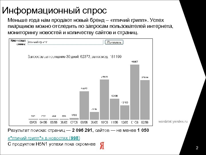 Информационный спрос Меньше года нам продают новый бренд – «птичий грипп» . Успех пиарщиков можно отследить по запросам пользователей интернета, мониторингу новостей и количеству сайтов и страниц. wordstat. yandex. ru Результат поиска: страниц — 2 096 291, сайтов — не менее 1 050 «"птичий грипп"» в новостях (998) С продуктом H 5 N 1 успехи пока скромнее 2