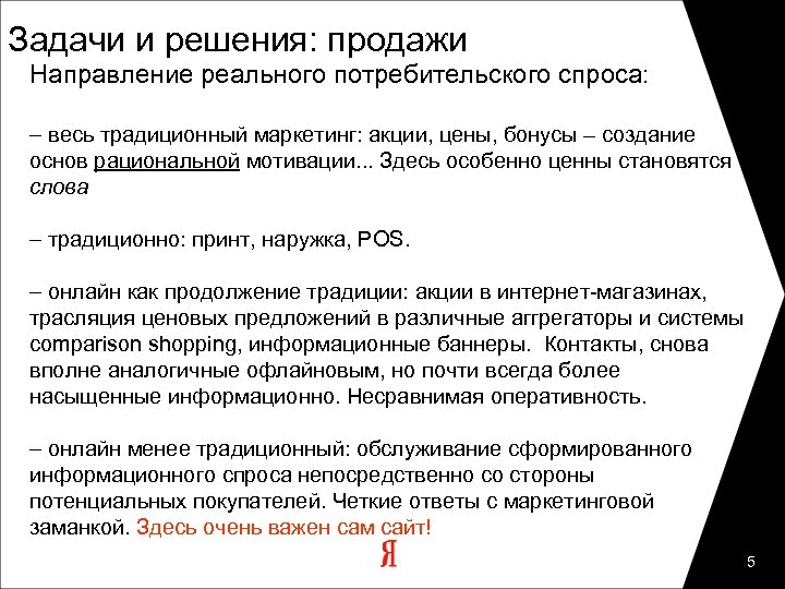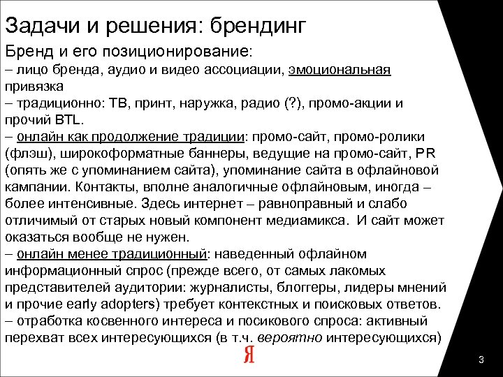 Задачи и решения: брендинг Бренд и его позиционирование: – лицо бренда, аудио и видео ассоциации, эмоциональная привязка – традиционно: ТВ, принт, наружка, радио (? ), промо-акции и прочий BTL. – онлайн как продолжение традиции: промо-сайт, промо-ролики (флэш), широкоформатные баннеры, ведущие на промо-сайт, PR (опять же с упоминанием сайта), упоминание сайта в офлайновой кампании. Контакты, вполне аналогичные офлайновым, иногда – более интенсивные. Здесь интернет – равноправный и слабо отличимый от старых новый компонент медиамикса. И сайт может оказаться вообще не нужен. – онлайн менее традиционный: наведенный офлайном информационный спрос (прежде всего, от самых лакомых представителей аудитории: журналисты, блоггеры, лидеры мнений и прочие early adopters) требует контекстных и поисковых ответов. – отработка косвенного интереса и посикового спроса: активный перехват всех интересующихся (в т. ч. вероятно интересующихся) 3