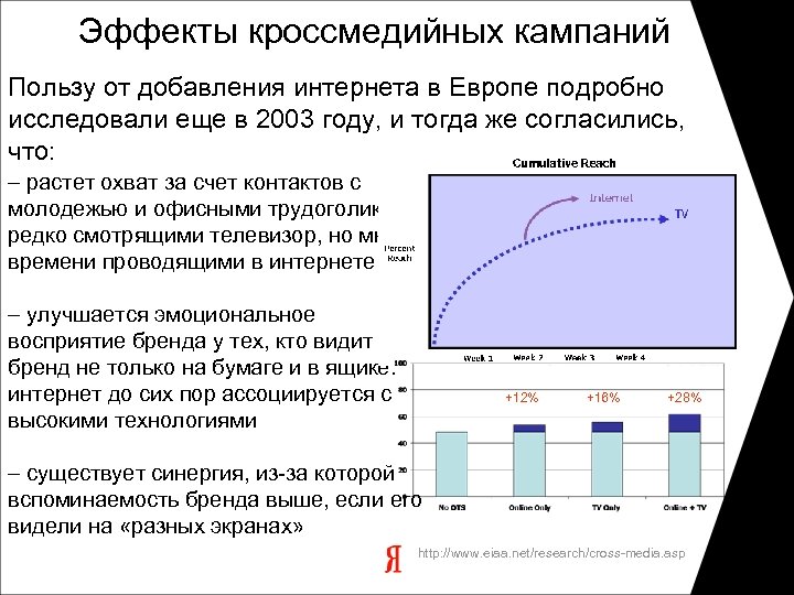 Эффекты кроссмедийных кампаний Пользу от добавления интернета в Европе подробно исследовали еще в 2003 году, и тогда же согласились, что: – растет охват за счет контактов с молодежью и офисными трудоголиками, редко смотрящими телевизор, но много времени проводящими в интернете – улучшается эмоциональное восприятие бренда у тех, кто видит бренд не только на бумаге и в ящике: интернет до сих пор ассоциируется с высокими технологиями +12% +16% +28% – существует синергия, из-за которой вспоминаемость бренда выше, если его видели на «разных экранах» http: //www. eiaa. net/research/cross-media. asp