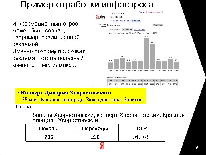 Пример отработки инфоспроса Информационный спрос может быть создан, например, традиционной рекламой. Именно поэтому поисковая реклама – столь полезный компонент медиамикса. • Концерт Дмитрия Хворостовского 28 мая. Красная площадь. Заказ доставка билетов. Слова – билеты Хворостовский, концерт Хворостовский, Красная площадь Хворостовский Показы Переходы CTR 706 220 31, 16% 6