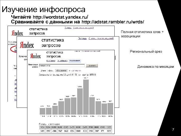 Изучение инфоспроса Читайте http: //wordstat. yandex. ru/ Сравнивайте с данными на http: //adstat. rambler. ru/wrds/ Полная статистика слов + ассоциации Региональный срез Динамика по месяцам 7