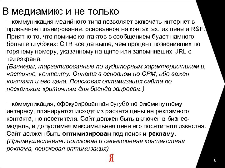 В медиамикс и не только – коммуникация медийного типа позволяет включать интернет в привычное планирование, основанное на контактах, их цене и R&F. Приятно то, что помимо контактов с сообщением будет намного больше глубоких: CTR всегда выше, чем процент позвонивших по горячему номеру, указанному на щите или запомнивших URL с телеэкрана. (Баннеры, таргетированные по аудиторным характеристикам и, частично, контенту. Оплата в основном по CPM, ибо важен контакт и его цена. Поисковая оптимизация сайта по нескольким критичным для бренда запросам. ) – коммуникация, сфокусированная сугубо по сиюминутному интересу, планируется исходя из расчета цены не рекламного контакта, но посетителя. Сайт должен быть включен в бизнесмодель, и допустимая максимальная цена его посетителя известна. Сайт должен быть оптимизирован под поиск и рекламу. (Преимущественно поисковая и селективная контекстная реклама, поисковая оптимизация) 8