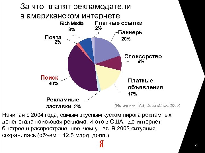 За что платят рекламодатели в американском интернете (Источники: IAB, Double. Click, 2005) Начиная с 2004 года, самым вкусным куском пирога рекламных денег стала поисковая реклама. И это в США, где интернет быстрее и распространеннее, чем у нас. В 2005 ситуация сохранилась (объем – 12, 5 млрд. долл. ) 9