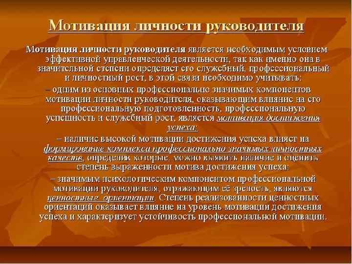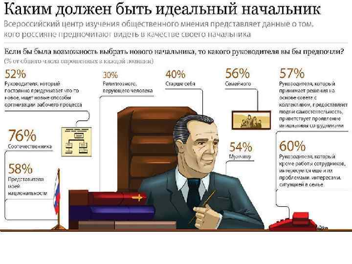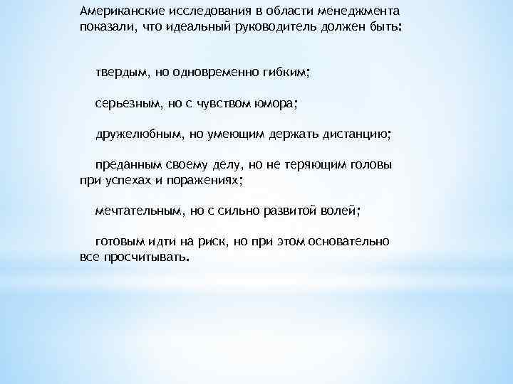 Американские исследования в области менеджмента показали, что идеальный руководитель должен быть: твердым, но одновременно гибким; серьезным, но с чувством юмора; дружелюбным, но умеющим держать дистанцию; преданным своему делу, но не теряющим головы при успехах и поражениях; мечтательным, но с сильно развитой волей; готовым идти на риск, но при этом основательно все просчитывать.