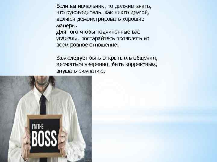 Если вы начальник, то должны знать, что руководитель, как никто другой, должен демонстрировать хорошие манеры. Для того чтобы подчиненные вас уважали, постарайтесь проявлять ко всем ровное отношение. Вам следует быть открытым в общении, держаться уверенно, быть корректным, внушать симпатию.