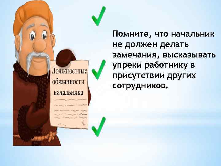 Помните, что начальник не должен делать замечания, высказывать упреки работнику в присутствии других сотрудников.