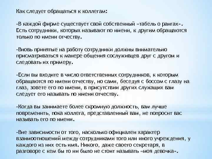 Как следует обращаться к коллегам: -В каждой фирме существует свой собственный «табель о рангах» . Есть сотрудники, которых называют по имени, к другим обращаются только по имени отчеству. -Вновь принятые на работу сотрудники должны внимательно присматриваться к манере общения сослуживцев друг с другом и следовать их примеру. -Если вы входите в число ответственных сотрудников, к которым обращаются по имени отчеству, но сами, беседуя с боссом с глазу на глаз, зовете его по имени, в присутствии других служащих вам следует его называть по имени отчеству. -Когда вы занимаете более скромную должность, вам лучше повременить, пока коллега, представленный вам, не попросит вас называть его по имени. -Вне зависимости от того, насколько официален характер взаимоотношений между сотрудниками того или иного учреждения, у каждого из них есть имя. Никого, даже своего секретаря, в разговоре с кем бы то ни было не стоит называть «моя девочка» .