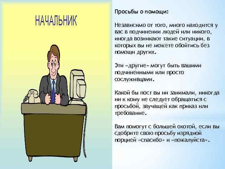Просьбы о помощи: Независимо от того, много находится у вас в подчинении людей или никого, иногда возникают такие ситуации, в которых вы не можете обойтись без помощи других. Эти «другие» могут быть вашими подчиненными или просто сослуживцами. Какой бы пост вы ни занимали, никогда ни к кому не следует обращаться с просьбой, звучащей как приказ или требование. Вам помогут с большей охотой, если вы сдобрите свою просьбу изрядной порцией «спасибо» и «пожалуйста» .