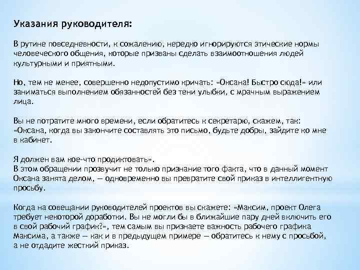 Указания руководителя: В рутине повседневности, к сожалению, нередко игнорируются этические нормы человеческого общения, которые призваны сделать взаимоотношения людей культурными и приятными. Но, тем не менее, совершенно недопустимо кричать: «Оксана! Быстро сюда!» или заниматься выполнением обязанностей без тени улыбки, с мрачным выражением лица. Вы не потратите много времени, если обратитесь к секретарю, скажем, так: «Оксана, когда вы закончите составлять это письмо, будьте добры, зайдите ко мне в кабинет. Я должен вам кое-что продиктовать» . В этом обращении прозвучит не только признание того факта, что в данный момент Оксана занята делом, — одновременно вы превратите свой приказ в интеллигентную просьбу. Когда на совещании руководителей проектов вы скажете: «Максим, проект Олега требует некоторой доработки. Вы не могли бы в ближайшие пару дней включить его в свой рабочий график? » , тем самым вы признаете важность рабочего графика Максима, а также — как и в предыдущем примере — обратитесь к нему с просьбой, а не отдадите жесткий приказ.