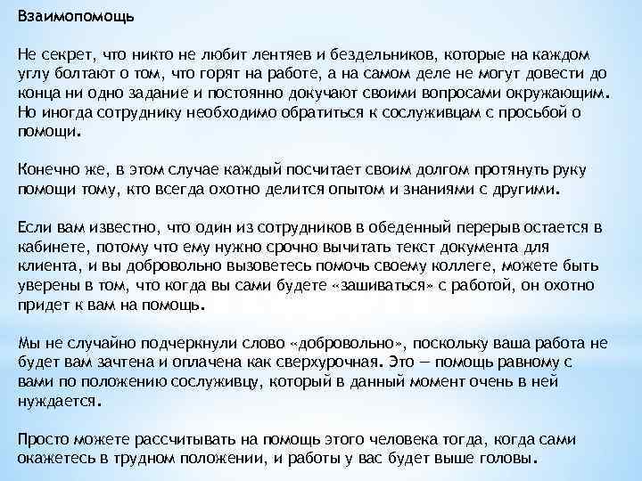 Взаимопомощь Не секрет, что никто не любит лентяев и бездельников, которые на каждом углу болтают о том, что горят на работе, а на самом деле не могут довести до конца ни одно задание и постоянно докучают своими вопросами окружающим. Но иногда сотруднику необходимо обратиться к сослуживцам с просьбой о помощи. Конечно же, в этом случае каждый посчитает своим долгом протянуть руку помощи тому, кто всегда охотно делится опытом и знаниями с другими. Если вам известно, что один из сотрудников в обеденный перерыв остается в кабинете, потому что ему нужно срочно вычитать текст документа для клиента, и вы добровольно вызоветесь помочь своему коллеге, можете быть уверены в том, что когда вы сами будете «зашиваться» с работой, он охотно придет к вам на помощь. Мы не случайно подчеркнули слово «добровольно» , поскольку ваша работа не будет вам зачтена и оплачена как сверхурочная. Это — помощь равному с вами по положению сослуживцу, который в данный момент очень в ней нуждается. Просто можете рассчитывать на помощь этого человека тогда, когда сами окажетесь в трудном положении, и работы у вас будет выше головы.