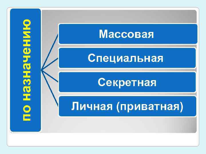 по назначению Массовая Специальная Секретная Личная (приватная)