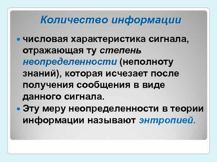 Количество информации числовая характеристика сигнала, отражающая ту степень неопределенности (неполноту знаний), которая исчезает после получения сообщения в виде данного сигнала. Эту меру неопределенности в теории информации называют энтропией.