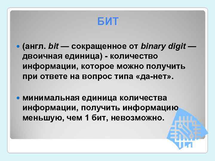 БИТ (англ. bit — сокращенное от binary digit — двоичная единица) - количество информации, которое можно получить при ответе на вопрос типа «да-нет» . минимальная единица количества информации, получить информацию меньшую, чем 1 бит, невозможно.