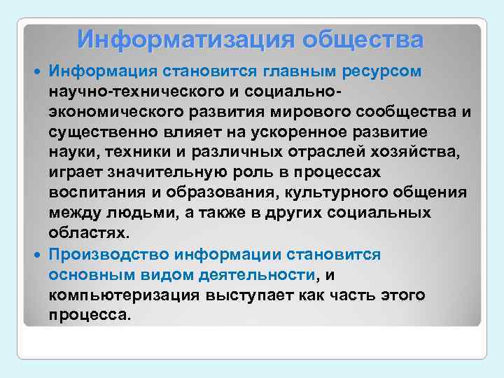 Информатизация общества Информация становится главным ресурсом научно-технического и социально- экономического развития мирового сообщества и существенно влияет на ускоренное развитие науки, техники и различных отраслей хозяйства, играет значительную роль в процессах воспитания и образования, культурного общения между людьми, а также в других социальных областях. Производство информации становится основным видом деятельности, и компьютеризация выступает как часть этого процесса.