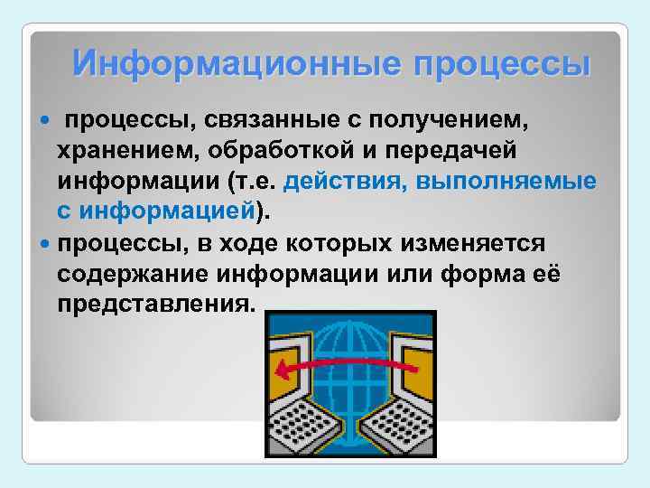 Информационные процессы, связанные с получением, хранением, обработкой и передачей информации (т. е. действия, выполняемые с информацией). процессы, в ходе которых изменяется содержание информации или форма её представления.