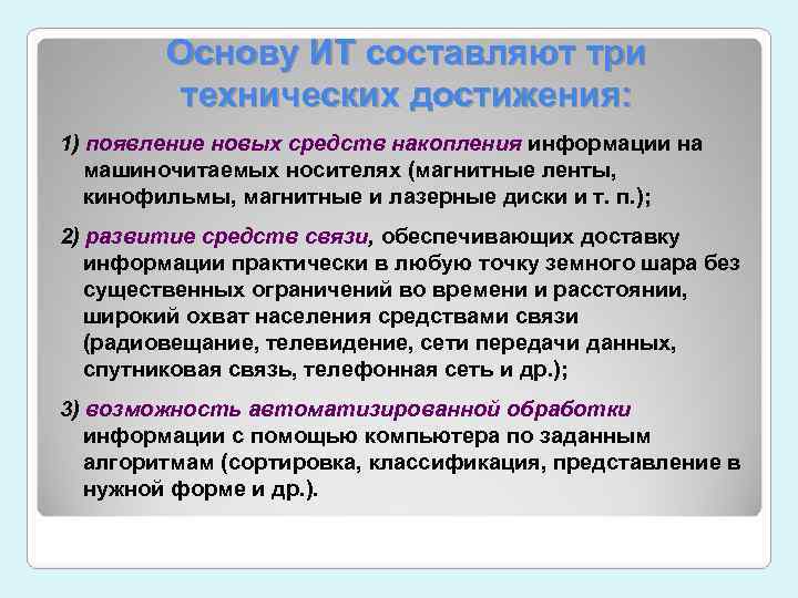 Основу ИТ составляют три технических достижения: 1) появление новых средств накопления информации на машиночитаемых носителях (магнитные ленты, кинофильмы, магнитные и лазерные диски и т. п. ); 2) развитие средств связи, обеспечивающих доставку информации практически в любую точку земного шара без существенных ограничений во времени и расстоянии, широкий охват населения средствами связи (радиовещание, телевидение, сети передачи данных, спутниковая связь, телефонная сеть и др. ); 3) возможность автоматизированной обработки информации с помощью компьютера по заданным алгоритмам (сортировка, классификация, представление в нужной форме и др. ).