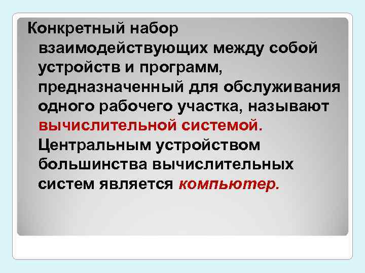 Конкретный набор взаимодействующих между собой устройств и программ, предназначенный для обслуживания одного рабочего участка, называют вычислительной системой. Центральным устройством большинства вычислительных систем является компьютер.