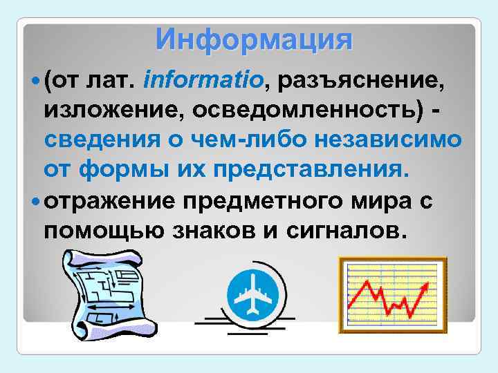 Информация (от лат. informatio, разъяснение, изложение, осведомленность) - сведения о чем-либо независимо от формы их представления. отражение предметного мира с помощью знаков и сигналов.