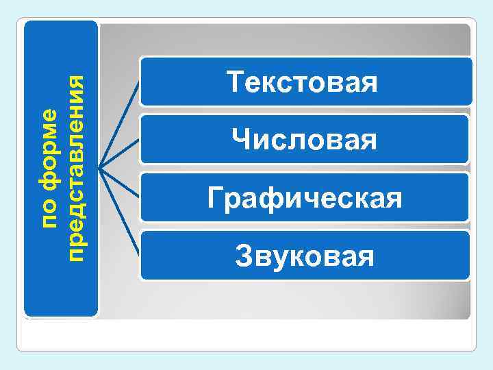 представления Текстовая по форме Числовая Графическая Звуковая