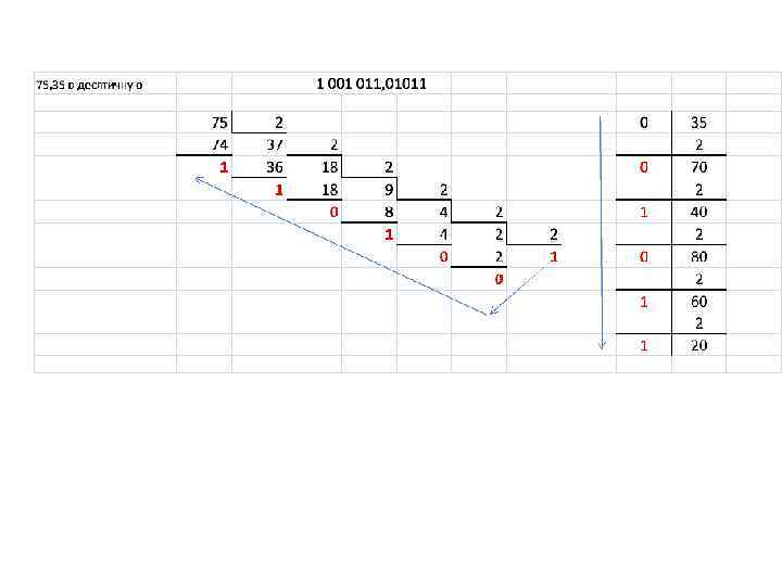 ПРЕОБРАЗОВАНИЕ ЧИСЕЛ ИЗ ОДНОЙ СИСТЕМЫ СЧИСЛЕНИЯ В ДРУГУЮ ПРАВИЛО ДЕЛЕНИЯ-УМНОЖЕНИЯ Для преобразования целых чисел используется правило деления, а для преобразования правильных дробей преобразования смешанных чисел — правило используются соответственно для целой и дробной частей числа. умножения. оба Для правила
