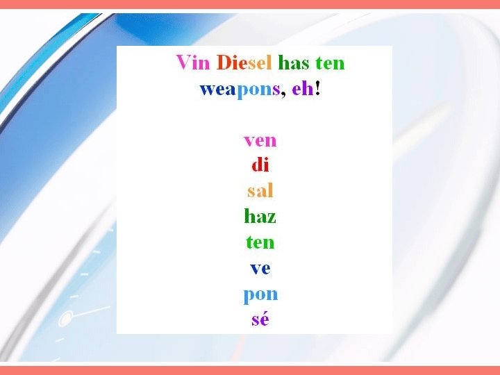 Los Irregulares venir = ven decir = di salir = sal * ir and ver have the same hacer = haz tú command, context will tener = ten determine the meaning. ir = ve poner = pon ser = sé (mantener= mantén) Ven di sal haz ten ve pon sé Vin Diesel has ten weapons, eh!