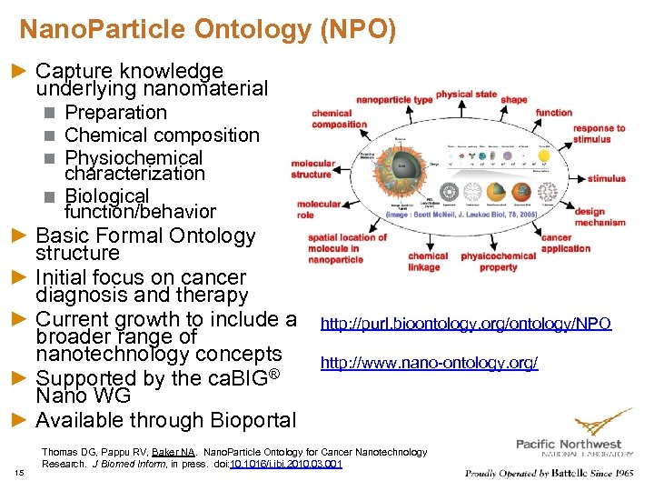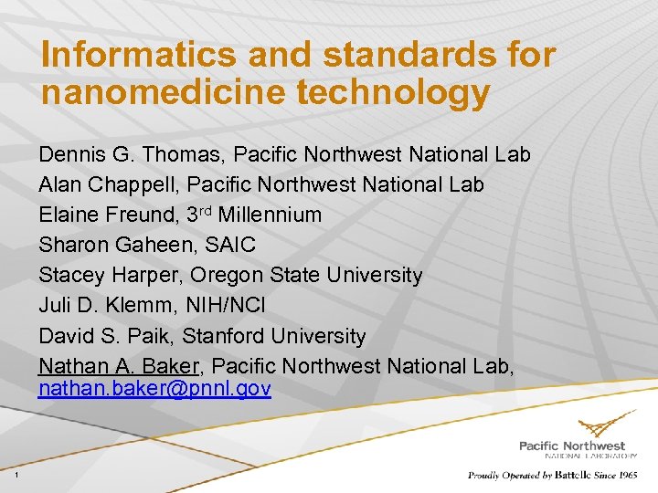 Informatics and standards for nanomedicine technology Dennis G. Thomas, Pacific Northwest National Lab Alan Chappell, Pacific Northwest National Lab Elaine Freund, 3 rd Millennium Sharon Gaheen, SAIC Stacey Harper, Oregon State University Juli D. Klemm, NIH/NCI David S. Paik, Stanford University Nathan A. Baker, Pacific Northwest National Lab, nathan. baker@pnnl. gov 1